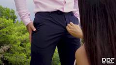 Em uma sessão de fotos, a morena sexy Geneva excita o fotógrafo que a fode ao ar livre. Não perca!
