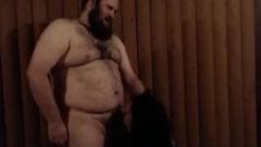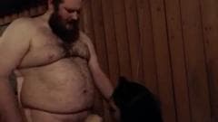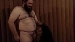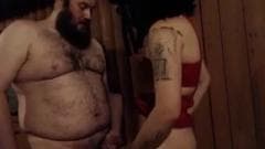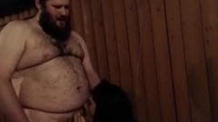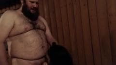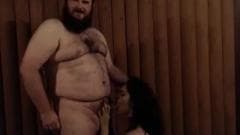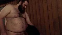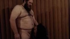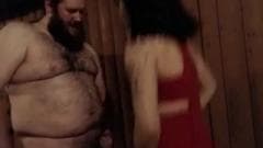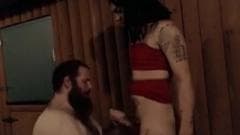 Um homem gordo e muito peludo e um transexual em um vestido vermelho sexy dão prazer um ao outro com um bom boquete