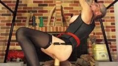 Essa velha mulher foi transexual ao longo de sua vida e hoje procura prazer ao penetrar sua bunda com um vibrador fixo.