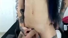 Essa linda morena tem um rosto muito pintado, já que ela é transexual e não quer ser notada, mas vamos ver seu pau que quase chega aos seios dela!