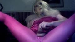 Esse homem excêntrico se veste com roupas femininas cor-de-rosa, coloca uma máscara e uma peruca loira e se masturba na frente da cam até ejacular!