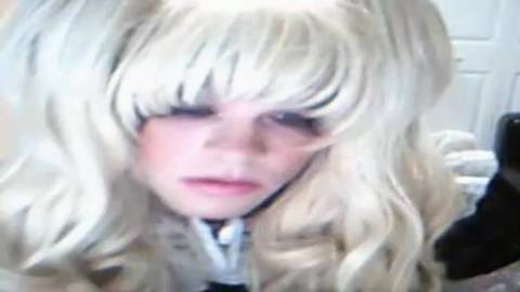 Um cara vestido de mulher e com uma peruca loira se masturba e se satisfaz com seu brinquedo sexual na frente da câmera.