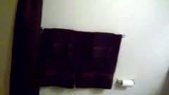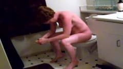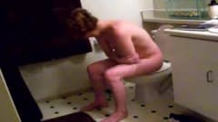 Esta mulher se despe completamente e senta-se no vaso sanitário. Nós a vemos mais tarde com a bunda no ar