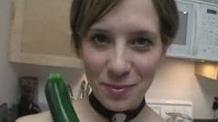 Ela brinca com uma abobrinha, colocando-a na sua buceta. Depois, use um vibrador para abrir sua bunda e se preparar para futuras visitas e gravar tudo