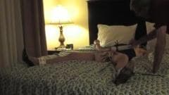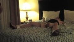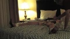 Um travesti, com sapatos sexys, amarrado e submisso, sofre na cama!