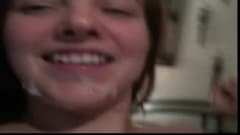 Este jovem casal decidiu gravar enquanto o cara esguicha no rosto bonito da mulher . Ela gosta de engolir leite quente desse tipo.