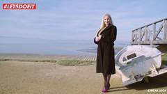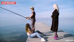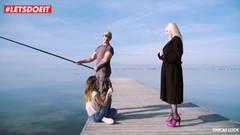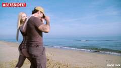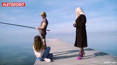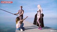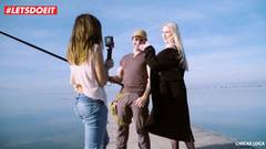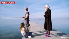 Uma super gata usando lingerie aborda um jovem casal começa a seduzir o cara. Não é preciso muito para acabar chupando o pau dele em frente à namorada