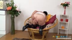 Esta ousada velhinha está se masturbando com os dedos, sua boceta enrugada e seus peitos grandes e pingando. Ela usa meia-calça preta para ficar sexy!