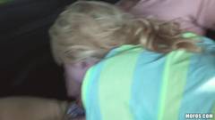 Essa loira é super safada e cheia de tesão, então ela mostra os peitos e chupa o pau do cara no carro, dirigindo por uma avenida.