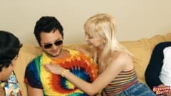 Essa linda mulher é uma ninfomaníaca loira que está se divertindo em uma festa no estilo dos anos 70, onde os rapazes vão se divertir transando com ela