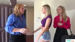 Quando a mãe e o padrasto visitam sua linda filha, uma pequena massagem pode rapidamente tornar-se um trio no sofá, que todos vão gostar.