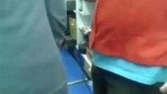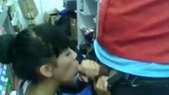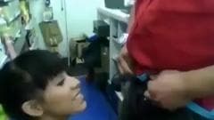 Atrás do balcão da loja o cara baixa as calças e deixa seu pau à disposição de uma morena jovem que lhe dá um boquete de garganta profunda e engole a porra