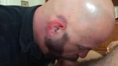Neste vídeo amador, você vê um cara barbudo e careca chupando o pau do namorado até que ele ejacule e engula.