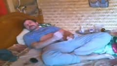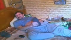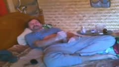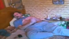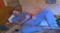 Este homem de bigode se diverte em sua cama enquanto se masturba na frente da câmera até gozar sozinho. Imagine um cara que pega.
