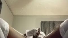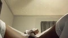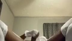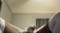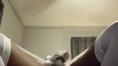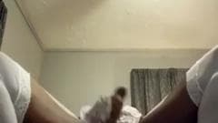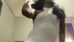 Uma transexual negra usa calcinha branca e uma máscara para que não a reconheçam enquanto se masturba.