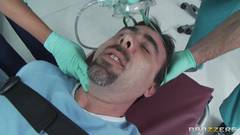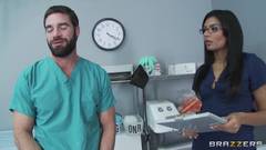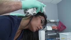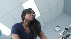 Essa médica morena e gostosa quer agradecer os bons serviços do seu infermeiro pagando um delicioso boquete. Depois ela deita na maca e bate uma siririca!