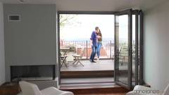 A morena está tomando seu café no terraço. Está frio então ele a leva para dentro de casa para esquentá-la sem roupa, com seu greande pau! Dá muito tesão!