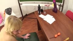 Esta professora loira e bonita tem uma bunda bem legal com a qual ela gosta de se divertir colocando brinquedos e depois o pau desse cara bonito.