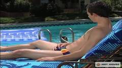 O cara está dando um mergulho e seu amigo o está observando. Quando ele sai da água, seu pau é raspado. Um pouco de lambidas na bunda e uma foda.