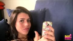 Ela está apenas de lingerie e meias e vai mostrar seus pés super delicados enquanto mexe no celular. Ela tira as meias para você ver seus pés ainda melhor!