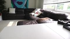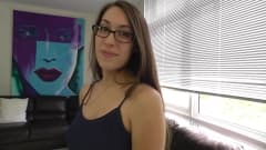 Uma linda prostituta morena de óculos vai ser fodida no estilo cachorrinho no sofá de couro por um homem que a espeta bem de quatro.