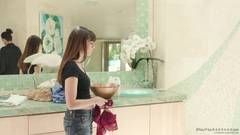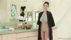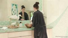 Uma sogra safada vai se divertir com a nora, com uma ducha, uma boa massagem e um ótimo cunilíngua no programa do dia.