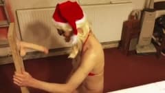 Este garoto fantasiado de Papai Noel recebeu um presente especial. Um grande vibrador com o qual ele vai se divertir muito. Ele o chupa e o enfia na bunda.