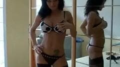 O namorado encontrou uma solução para dar a ela mais prazer a ela. Ele coloca uma cinta com dildo e a penetra com seu pênis na xoxota e o dildo no cuzinho!