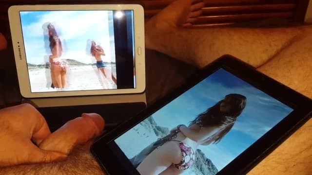 Ele tem 2 tablets com fotos de sua puta favorita e bate uma punheta tão empolgado que rapidamente esguicha muita porra na tela, olha!