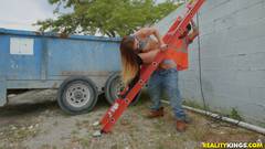 Ela Reese já transou com todos os trabalhadores da construção civil. Esse homem tatuado transa com ela em uma escada e em uma plataforma.