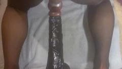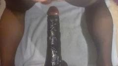 Essa trans posiciona seu grande dildo preto, colando-o na parede. Imediatamente, ela o enfia até o fundo do seu cuzinho, indo para frente e para trás.