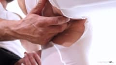 O desejo de transar com ela é tão forte que ele nem mesmo tira as meias. Ele as arranca com as mãos e a fode.