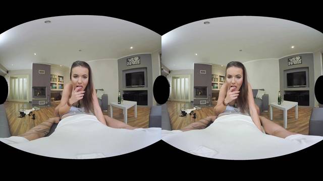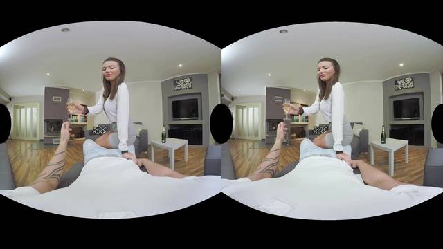 Feliz com a promoção, a mulher traz champanhe. Depois de beber, ela provoca o homem e abaixa sua calça para lhe fazer um boquete.