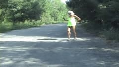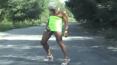 Em vários locais, vemos o mesmo indivíduo disfarçado de garota, usando uma peruca loira e uma saia curta com salto alto.