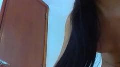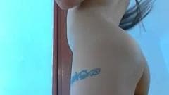 Ela aparece assim, cheia de vontade de te agradar. O close mostra os seus seios grandes, uma bunda grande, o dildo entrando e um pau enorme esguichando.