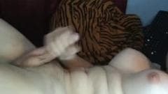 Morena trans peitudona batendo punheta e lambendo o próprio pau!