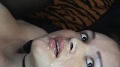 Essa morena tem peitos grandes, mas também um pau generoso! Ela ela vai chupar a cebecinha do próprio cacete, fazer um auto-facial e lamber a sua porra!