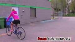 A jovem vadia Candy Kiss, masturba sua buceta na sua bicicleta; ela é uma vadia excitada e está molhadinha!