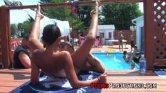 Bella tem sua buceta lambida por um cara enquanto chupa o pau de outro na piscina, é fodida por vários caras e goza em jatos