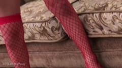 A gatinha asiática super sexy de lingerie vermelha põe os peitos pra fora e começa a se acariciar. Ela passa os dedos pela bucetinha e depois mete o dildo!
