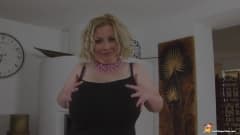 Sob sua blusa, essa loira madura esconde seios impressionantes. Ela os tira do sutiã e começa a massageá-los com óleo.