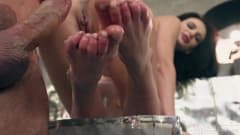 Apesar de ser um homem maduro, seu duro pau, ainda deixa sua jovem esposa louca. Ela o punheta com os pés antes de lhe dar a buceta.