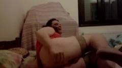 Um cara gordo com roupas de mulher se masturba com dildos no cu