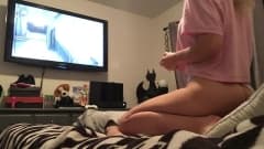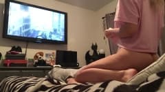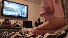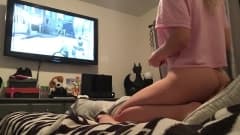 Uma jovem loira excitada senta-se no rosto de seu homem e, sem parar para jogar um jogo de computador, é picada como uma prostituta profissional!
