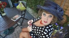A mulher idosa brinca com seus brinquedos sexuais no jardim.