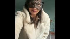 Milf grava um vídeo caseiro na frente da webcam enquanto ela mal está vestida com uma meia transparente com seus peitos e bunda vistos