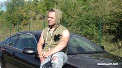 Um homem musculoso está transando com uma avó encontrada por acaso na estrada. Provavelmente um golpe de sorte, mas que gostoso.