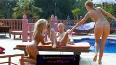 Estas três lésbicas loiras e jovens vão passar uma tarde ao lado da piscina e para tornar tudo mais divertido convidam seu dildo duplo para a festa.