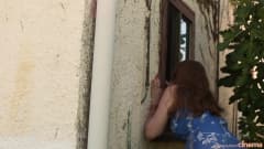 Resumindo a história! A jovem Chloe B espreita um cara pelado e se masturba num prado, depois ele transa com sua esposa.