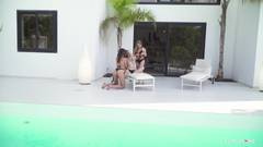 Três novinhas lésbicas se chupando e masturbando ao ar livre na piscina e depois um mergulho peladas e mais masturbação.